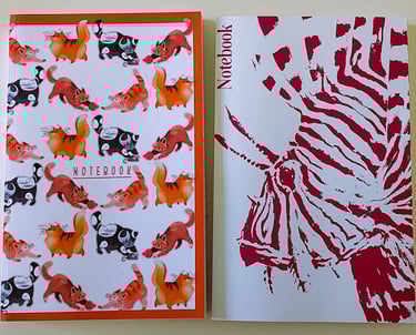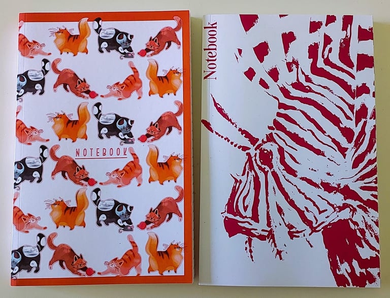 Some are hand-drawn designs by my brother, George Bocking (see Lionfish notebook). Some are digital drawings I have done turned into notebooks. And some are designed by me using digital art tools - AI deigns or free licence products that then adjust and make my own through creative amendments.