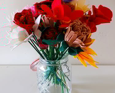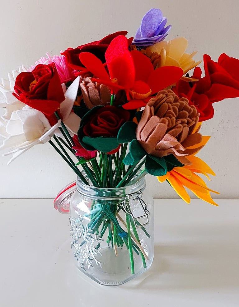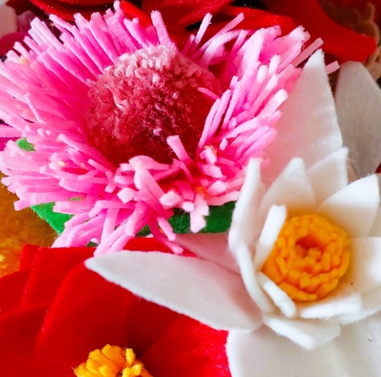 Where possible I recycle wool and felt to create these bouquets and I keep my wastage to a minimum by using the fluff trimmings as toy stuffing and the felt off cuts in pictures and for other flowers.