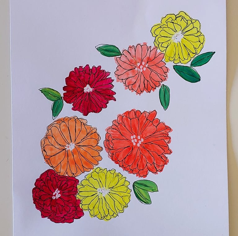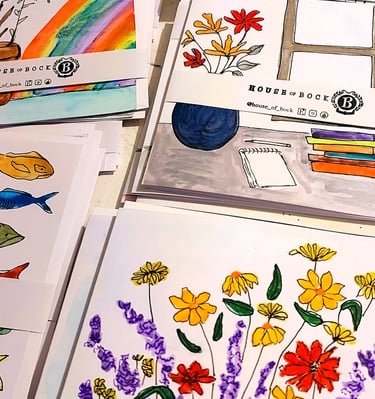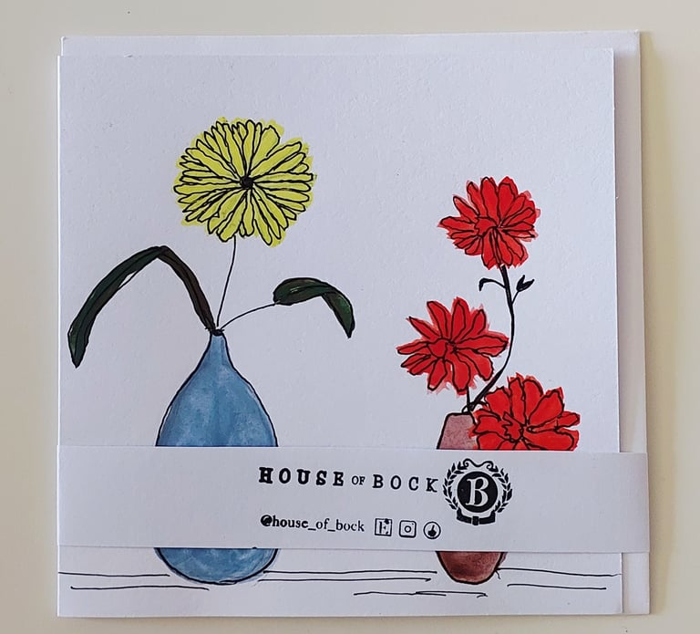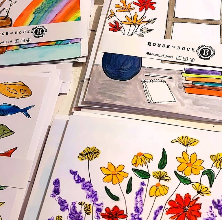 I have recently discovered home much I love creating greeting cards - hand-drawn and hand painted with gouache paints. My designs are whimsical and childlike. They will often depict simple settings of windows to the outside, or windowsills with vases of flowers. I like painting wildflowers and flower blooms, I like painting apples and pears still-life's. I like paintings boats on a sandy shore and cartoon styled crabs.